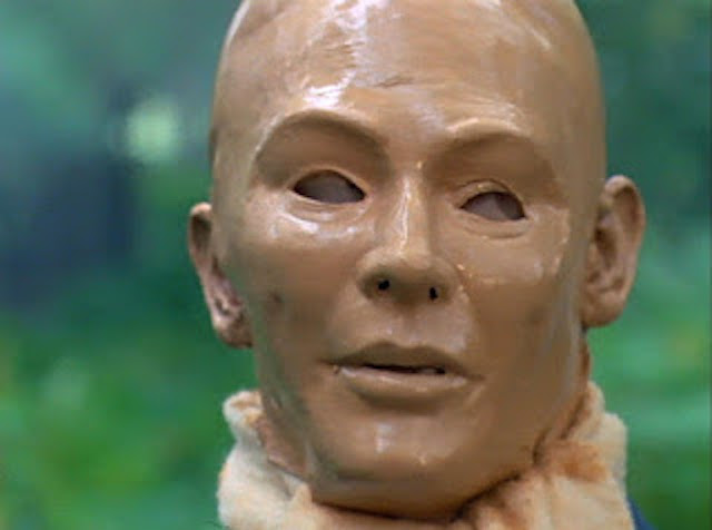The shop window dummies, like the Tussauds waxworks are replicas that whilst realistic to some extent, also are just wrong – a distorted image of a human face and engender a sense of unease. I think it is because the visual representation of the face is a primary method we use for recognition and identification of an individual, as such it is fundamental to our self – but anything that disturbs that is unsettling to us. The face is also key to our understanding of what others are trying to communicate, to their emotional state – as such it is fundamental for empathy and understanding. The blank, eyeless face mask of the Autons, takes the show in a similar direction, although much less explicitly so, as ‘Robots of Death’. With the distortion of the human form, one without body language or tell-tale non-verbal signals. The attempt to replicate the human in plastic becomes horrific, a terrible parody of the form.