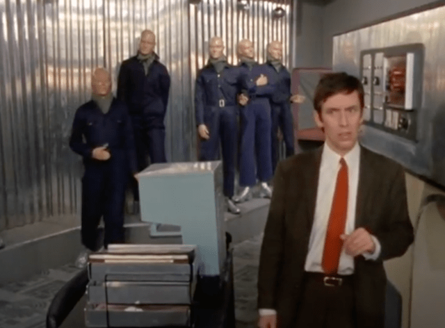 Despite all of those influences analyzed in the previous article, ‘Spearhead from Space’ is also massively original and imaginative. Why? Well because, like ‘The Plastic Eaters’ episode of Doomwatch (shown in 1970 – months after ‘Spearhead’ aired), it takes a modern innovation (plastic) which is suddenly all pervasive in contemporary life and it turns into a source of horror. More than that, it forsees a point when plastic crap (plastic daffodils and troll dolls etc.) will become a major issue for the species on our planet. ‘The Plastic Eaters’ is very prescient in that it involves a virus which has been engineered to break down plastic waste escaping in the wider world. In that world, dealing with plastic waste unleashes a major issue for society as airplanes fall apart in mid air and the all pervasive nature of plastic in the fabric of our lives becomes a weakness.